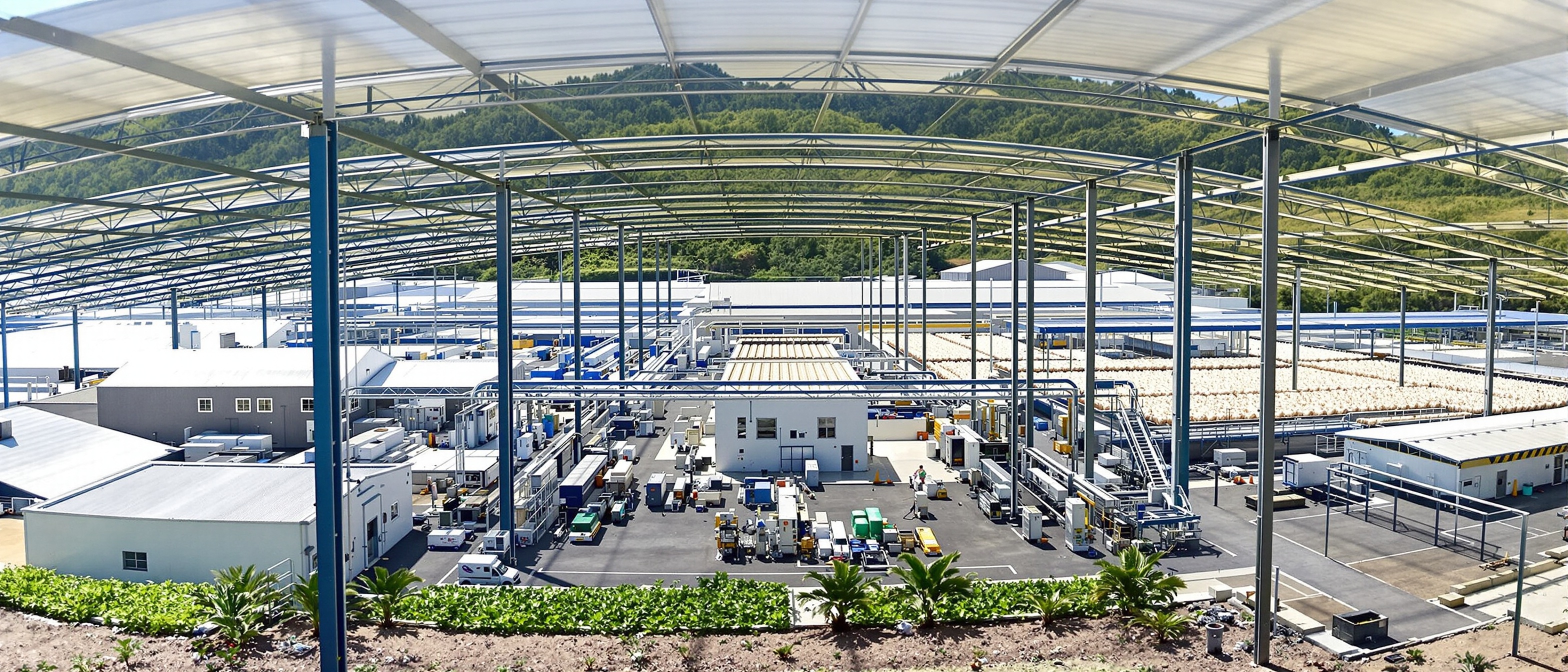 Structure galvanisée à chaud, tôles isolantes, laine de verre HQ, plafond incliné pour ventilation latérale. Durée de vie 20+ ans.